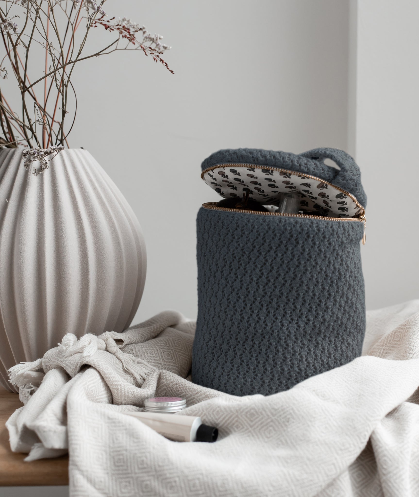Toilettasken har 5 rum indeni og god højde, så det er nemt at organisere de personlige sager. Hank og lynlås.  Strikket i 100% økologisk bomuld - GOTS certificeret.