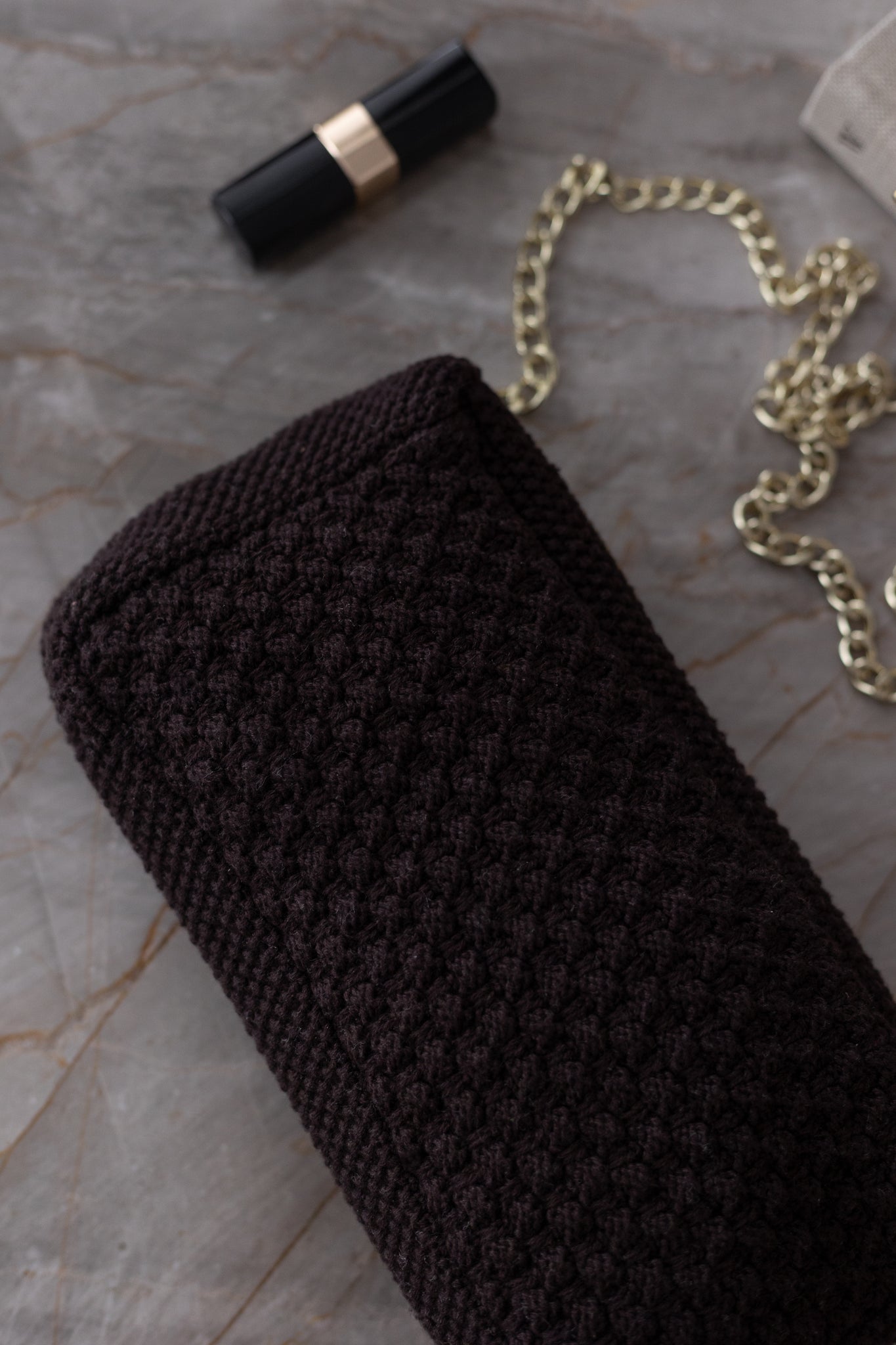Clutch med sling kæde i vores nye farve Choclate, der leder tankerne hen på naturen, med regulerbar lænke i mat guld, nikkelfri. Lænken kan tages helt af, så du har en Clutch.