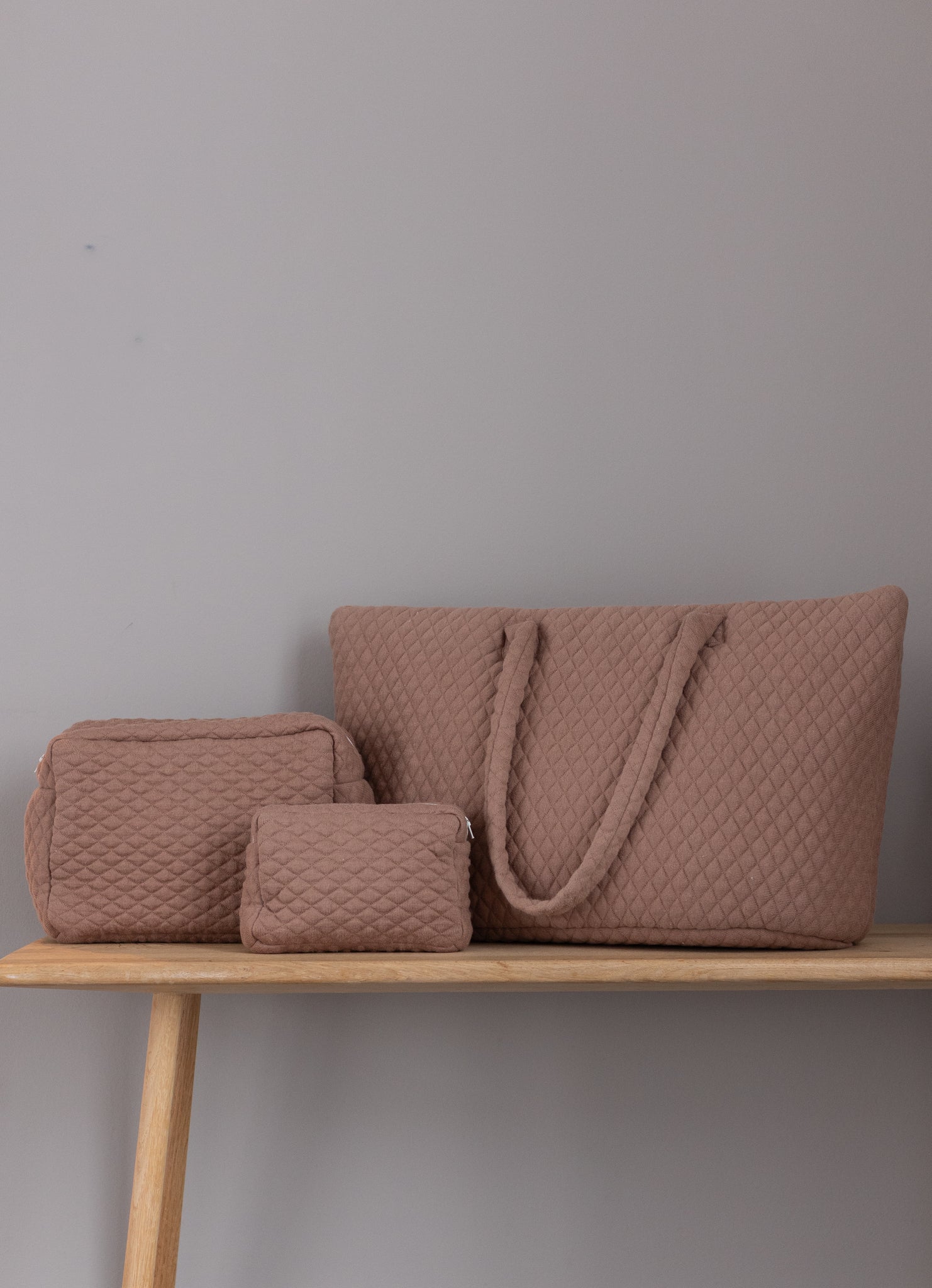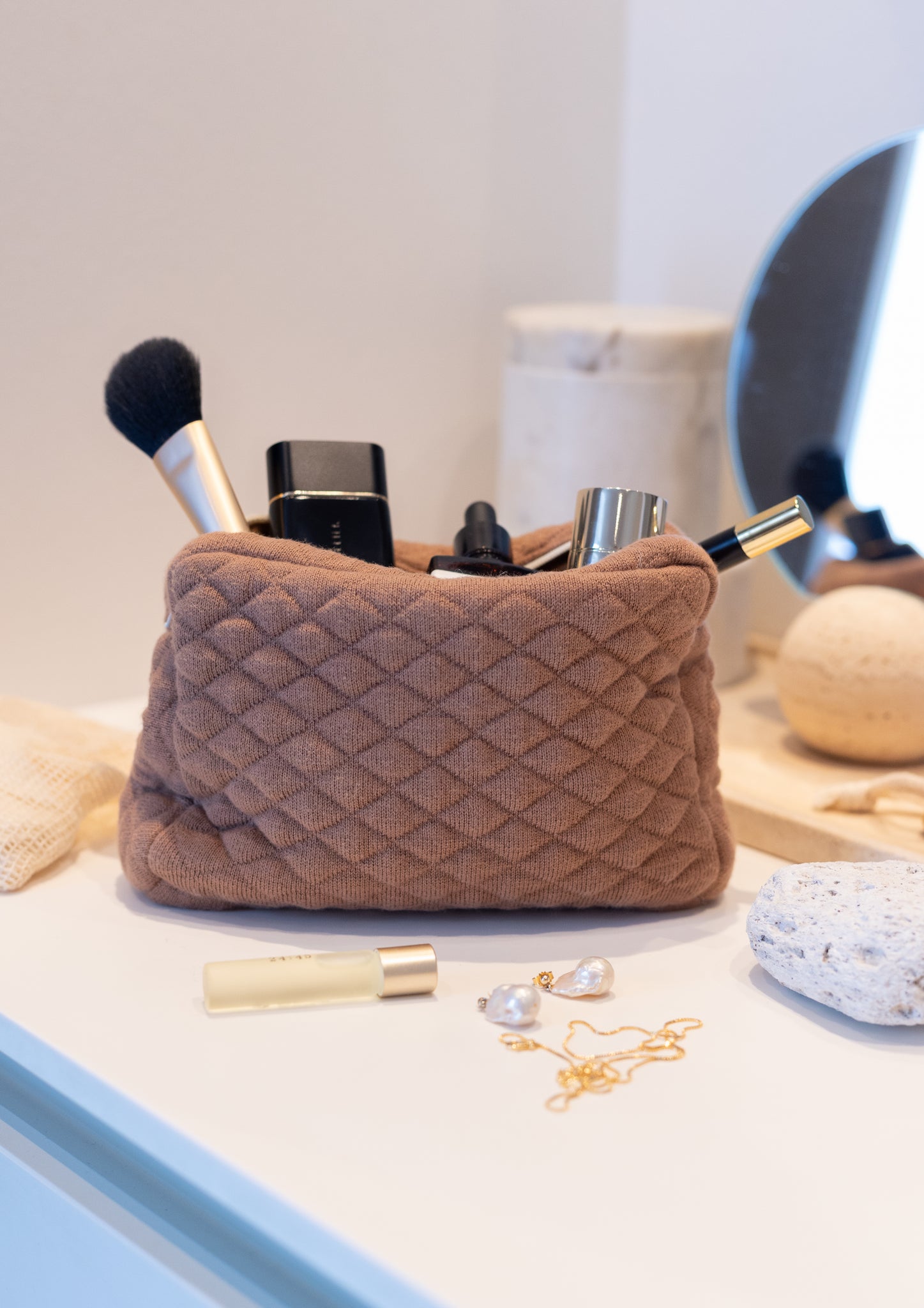 Quiltet Kosmetiktaske/pung med 2 rum indeni i den smukkeste Brown Sugar farve. Strikket udvendig i 75% økologisk bomuld og 25% polyester. Beklædt med ensfarvet bomulds fór og lukkes med lynlås, nikkelfri.