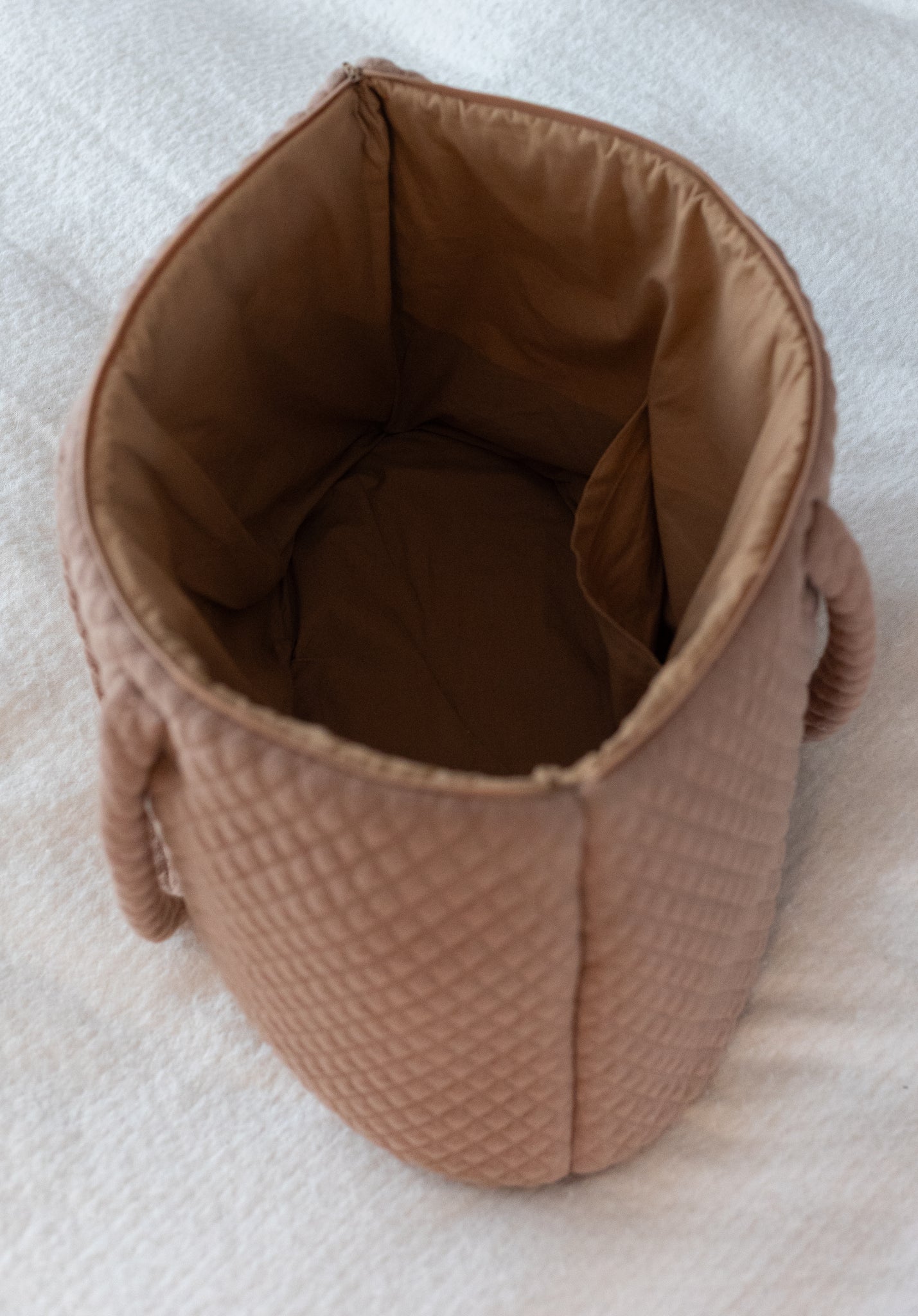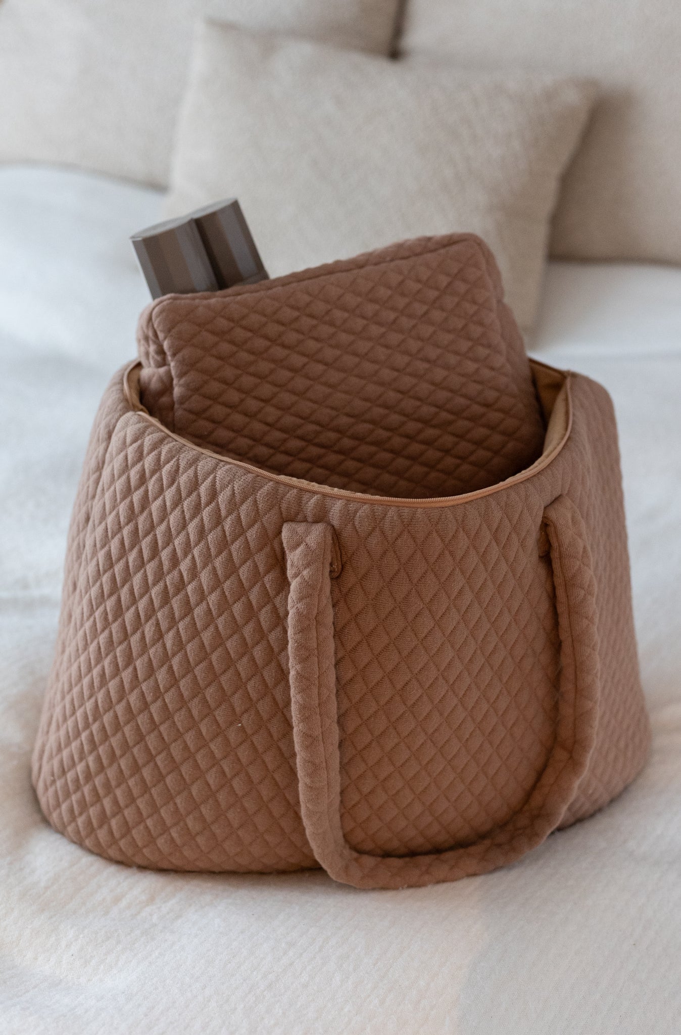 Quiltet Maxi Bag med 1 rum indeni og lille indvendig sidelomme i den smukkeste Brown Sugar farve. Strikket udvendig i 75% økologisk bomuld og 25% polyester. Beklædt med ensfarvet bomulds fór og lukkes med lynlås, nikkelfri.